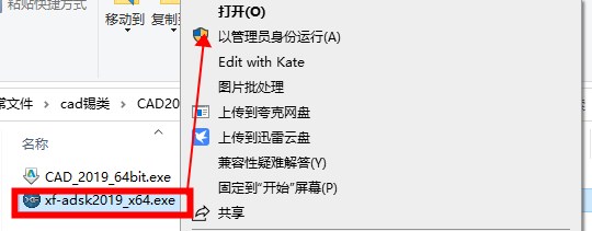 22、打开安装包解压后的【CAD2019】文件夹,鼠标右击【xf-adsk2019_x64】选择【以管理员身份运行】。